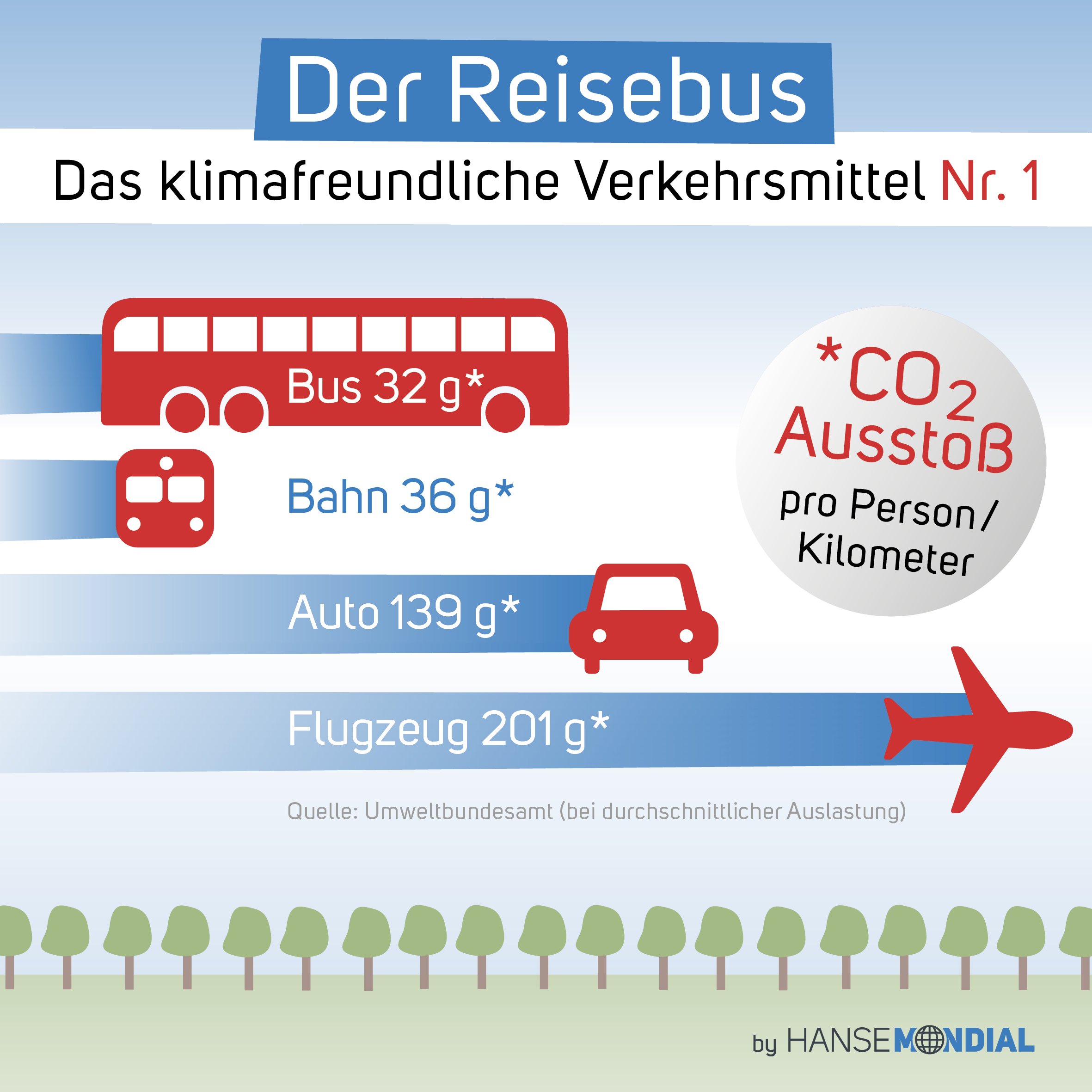 Beim Blick auf die Statistik des Kraftstoffverbrauch vom Umweltbundesamtes fällt die Dominanz der Fernbusse auf. Eine Studie des Umweltbundesamtes ermittelte für einen Reisebus bei 60 Prozent Auslastung auf 100 Kilometern Strecke 1,4 Liter Kraftstoff pro Fahrgast. Somit ist der Reisebus das grünste Verkehrsmittel.